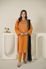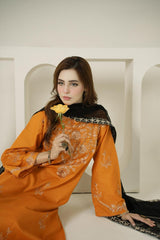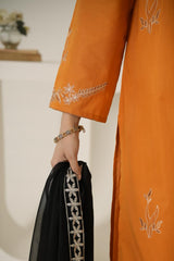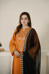 Completing the look is a lightweight chiffon dupatta in classic black, adorned with elegant embroidered borders that add contrast and a refined finish to the ensemble.