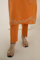The shirt features delicate embroidery on the neckline, sleeves, and daman, enhancing its graceful look. It is paired with a matching lawn cotton trouser that complements the outfit with subtle embroidered detailing at the hem.