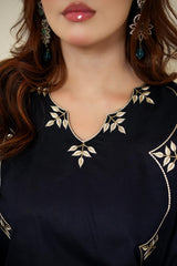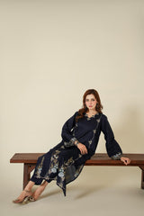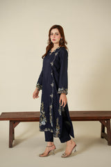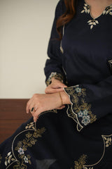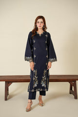 Elevate your everyday elegance with this beautifully crafted 2-piece embroidered dress in a sophisticated navy blue shade. Designed with a graceful silhouette, this outfit features delicate floral embroidery that adds a touch of timeless charm. The long straight shirt is enhanced with subtle embroidered motifs along the front, sleeves, and hemline, creating a refined and polished look.