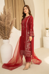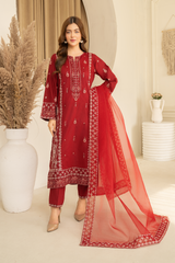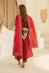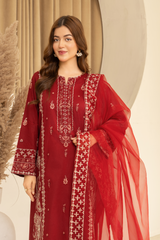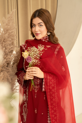 Elevate your festive and formal wardrobe with this stunning 3-piece embroidered red suit, a timeless ensemble that beautifully blends tradition with elegance. Crafted in a rich, deep maroon hue, this outfit is a must-have for the season’s special occasions, whether it's a family gathering, festive celebration, or cultural event.